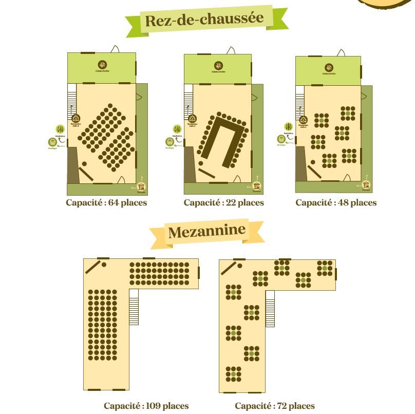 - En mezzanine : 110 m², capacité jusqu’à 109 places.